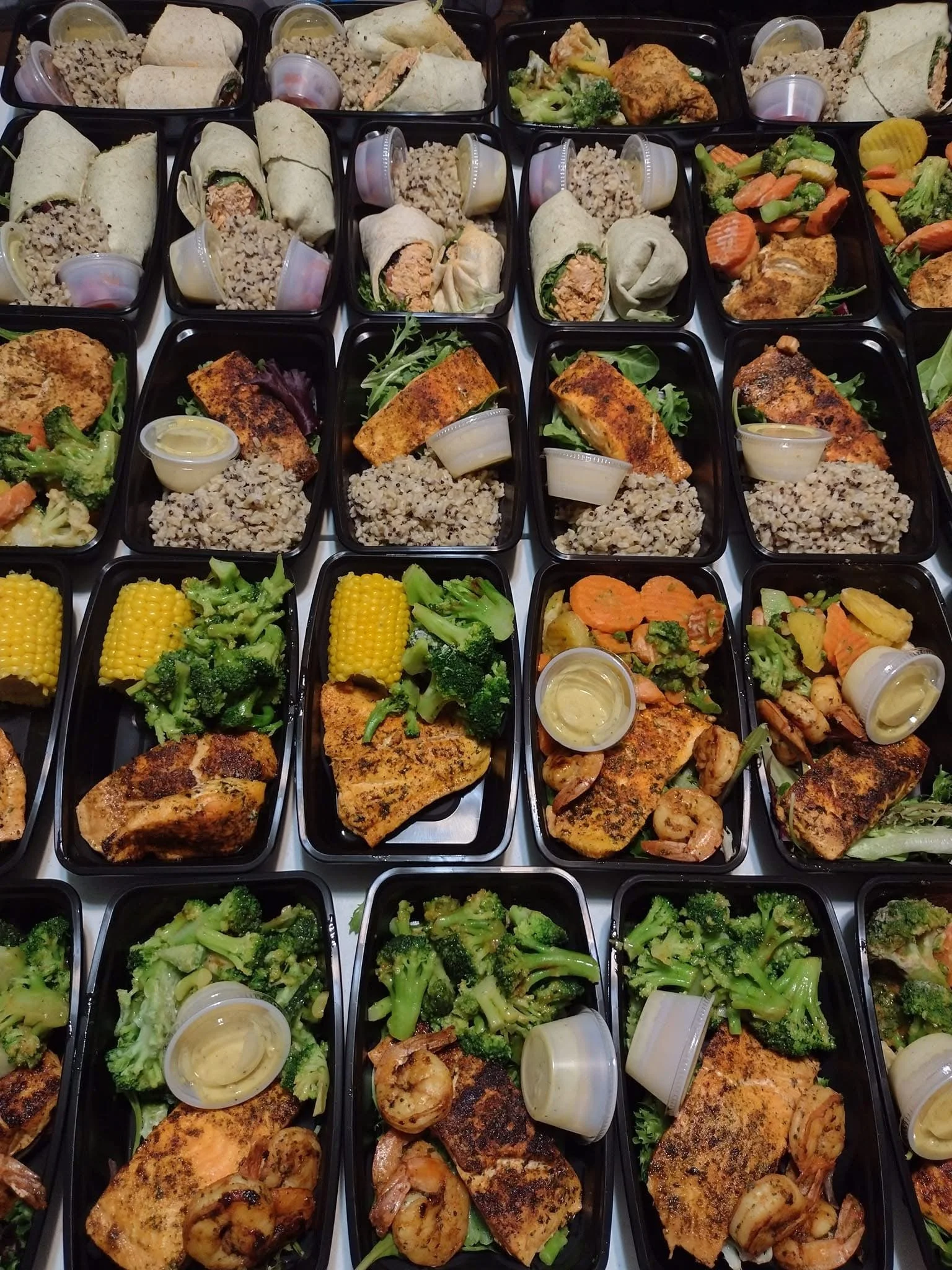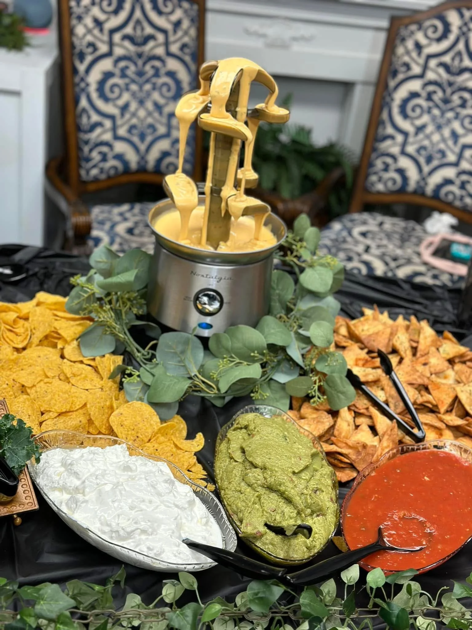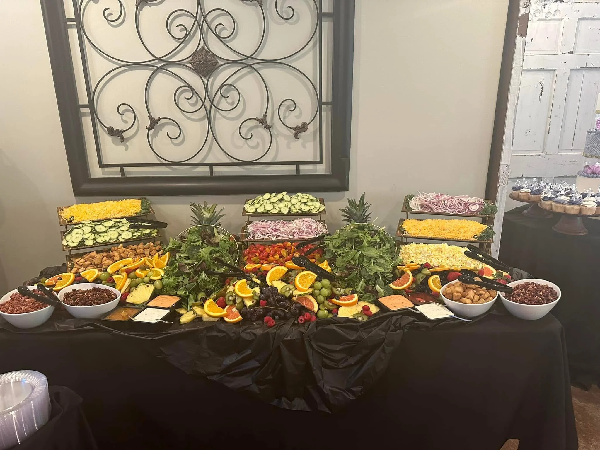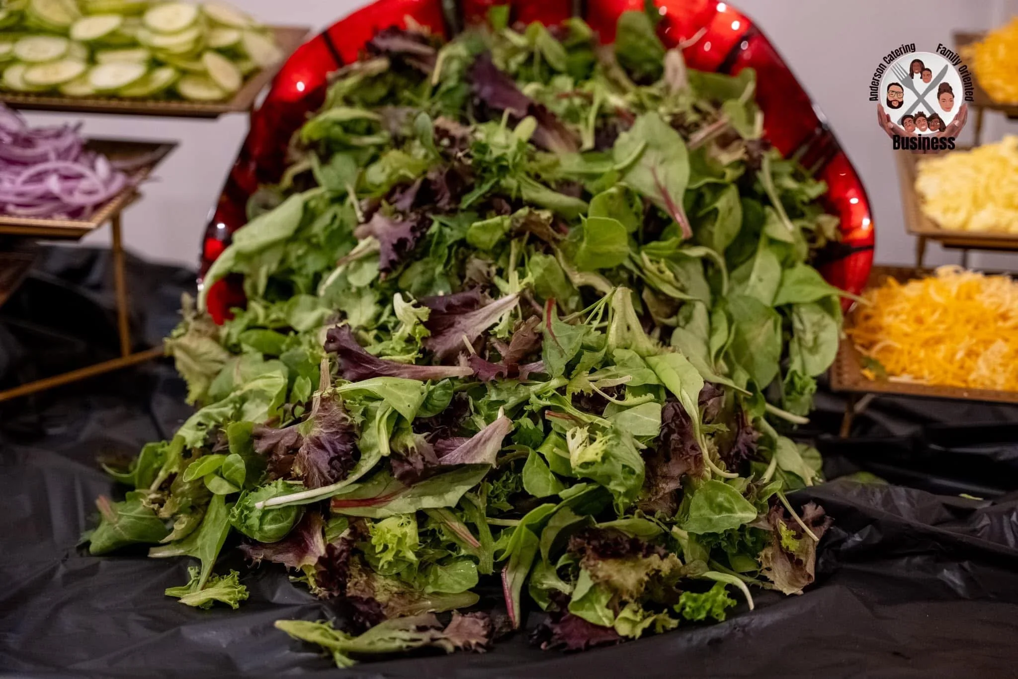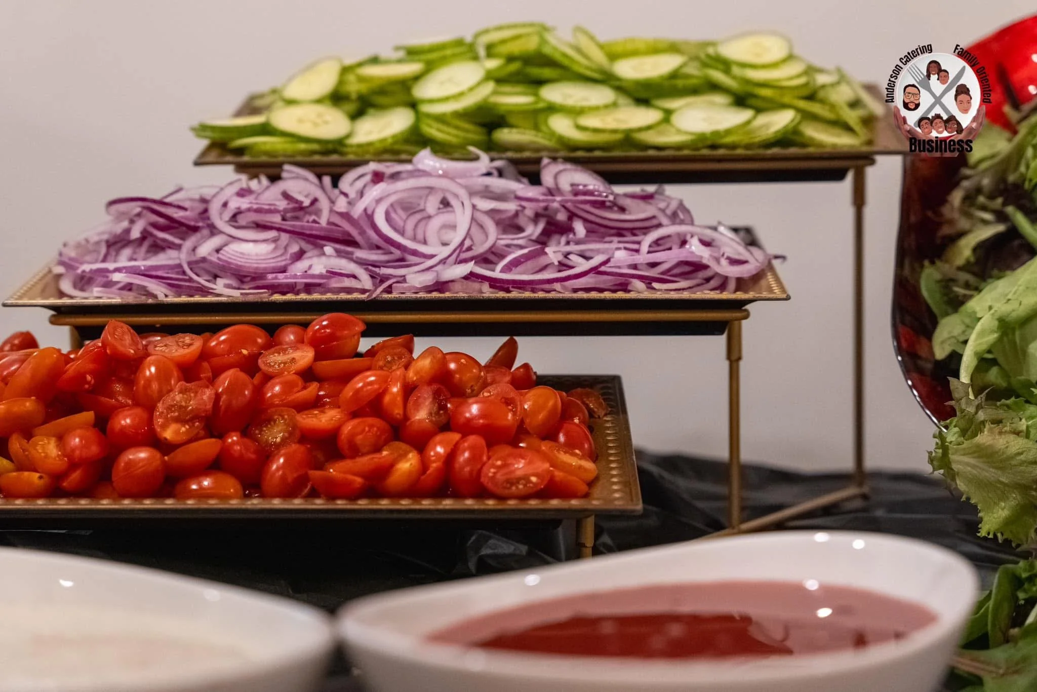 Salad bar with sliced cucumbers, red onions, cherry tomatoes, mixed greens, and two salad dressings on a black table.