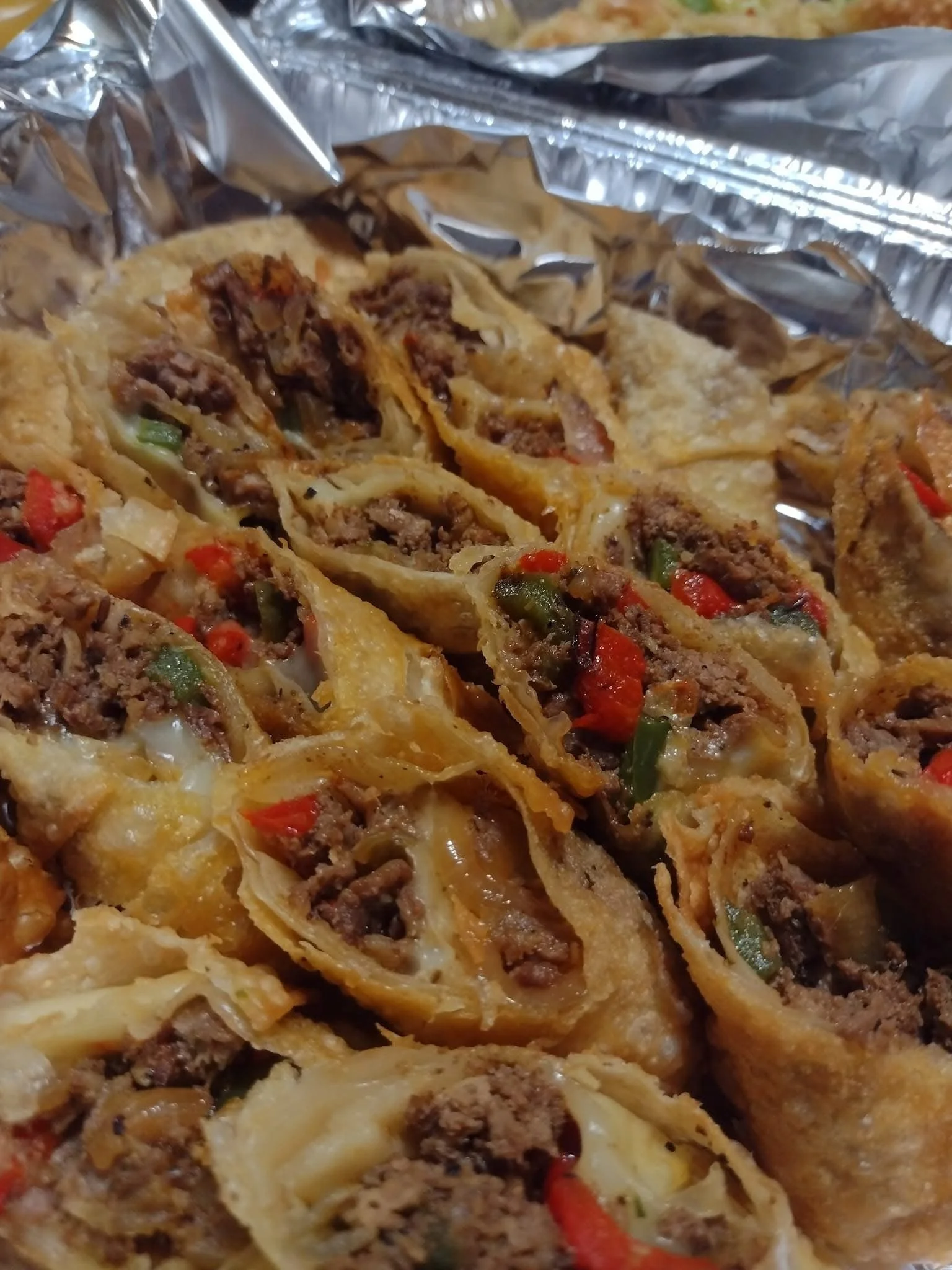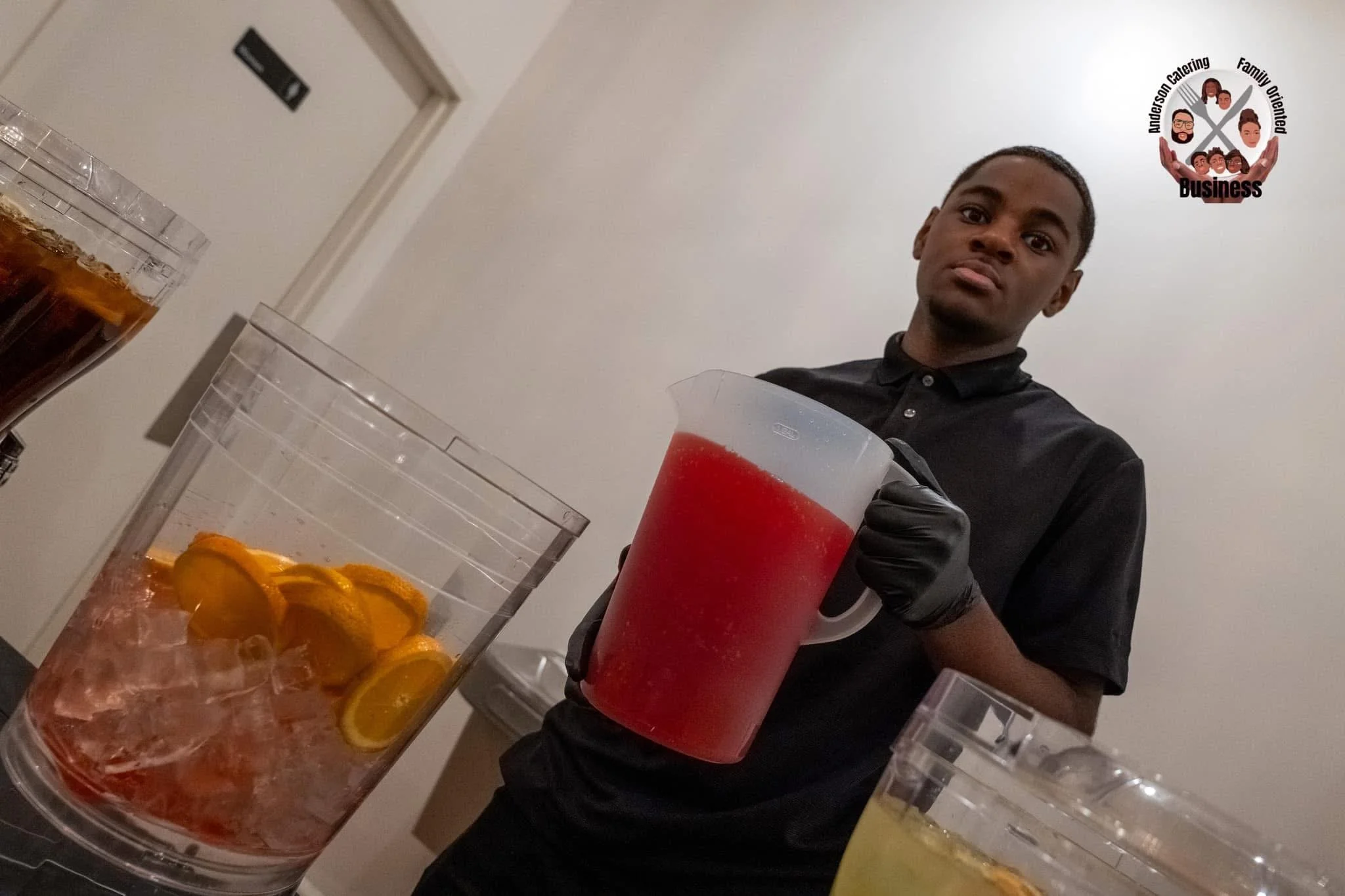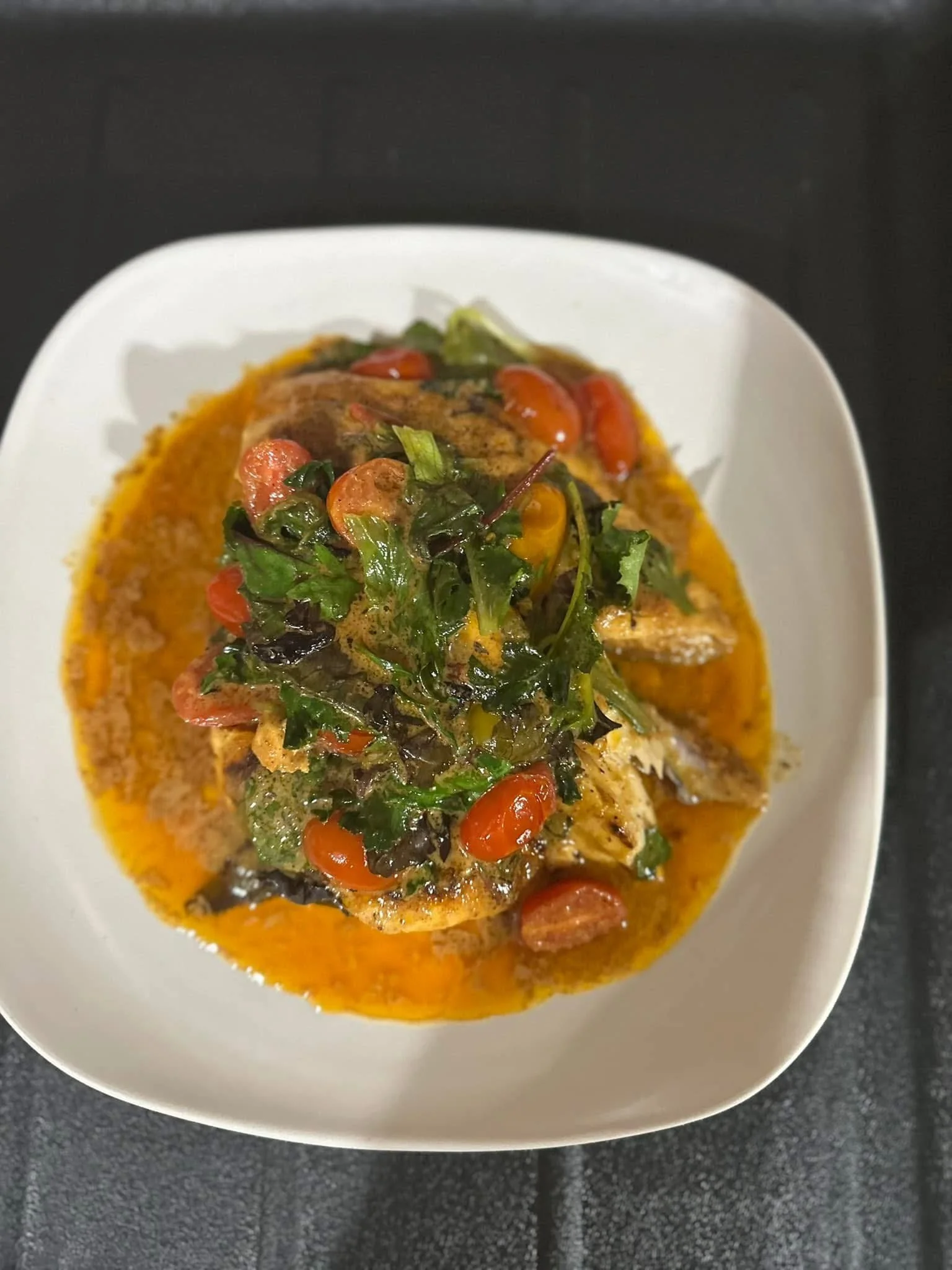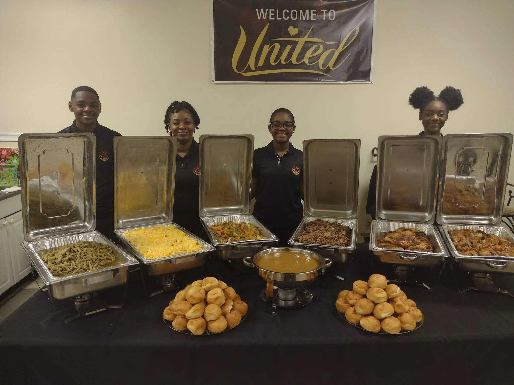 Salad bar with sliced cucumbers, red onions, cherry tomatoes, mixed greens, and two salad dressings on a black table.