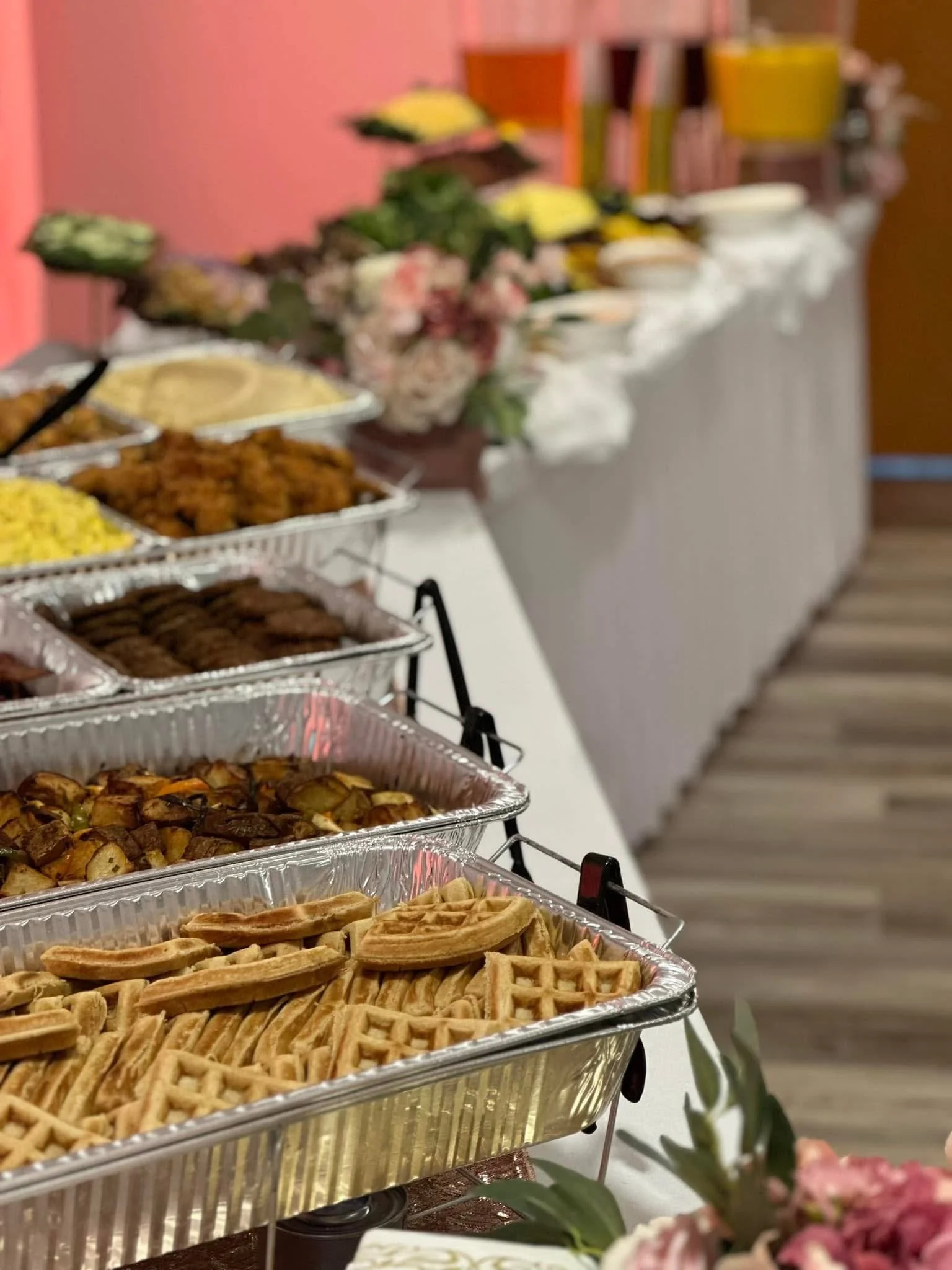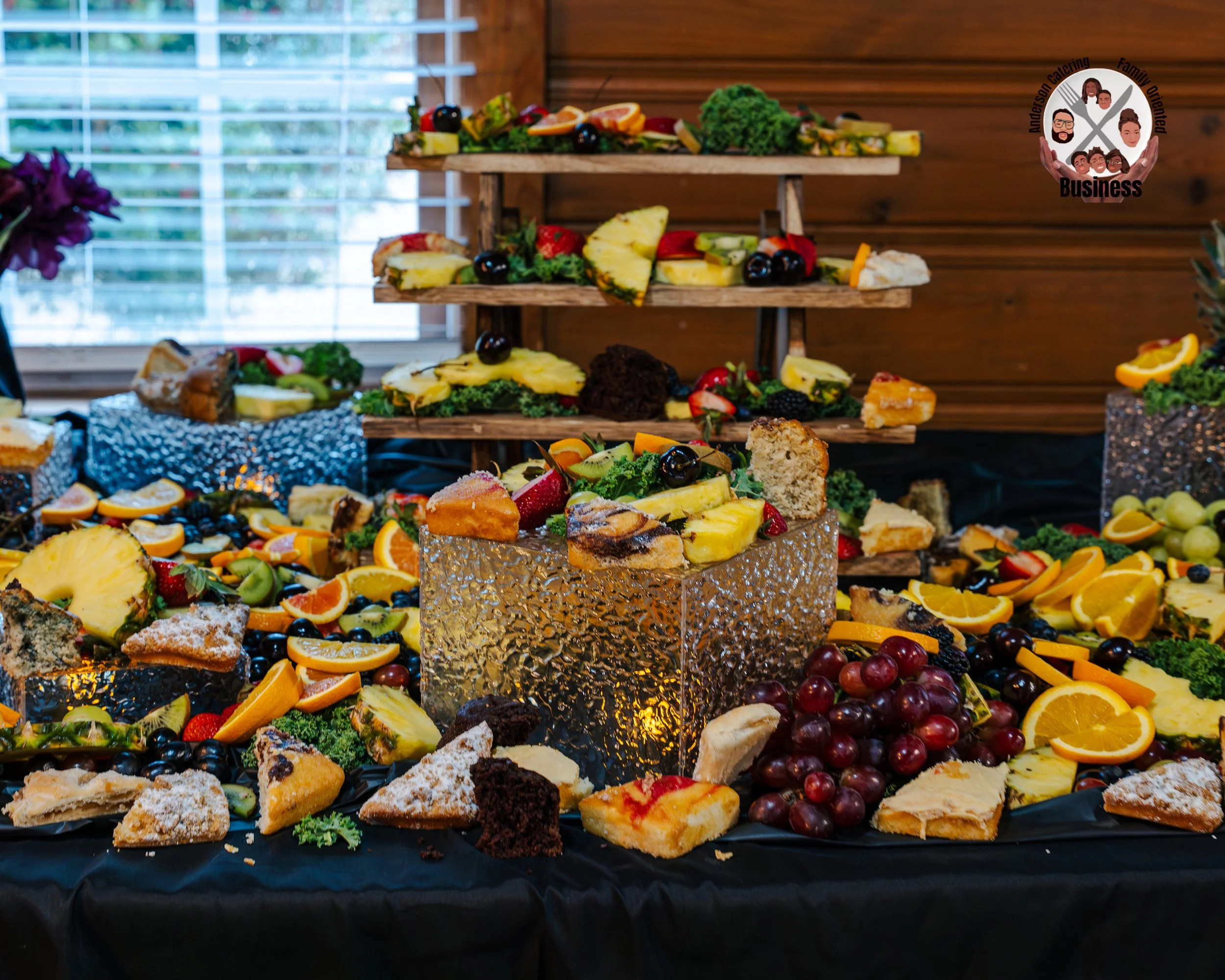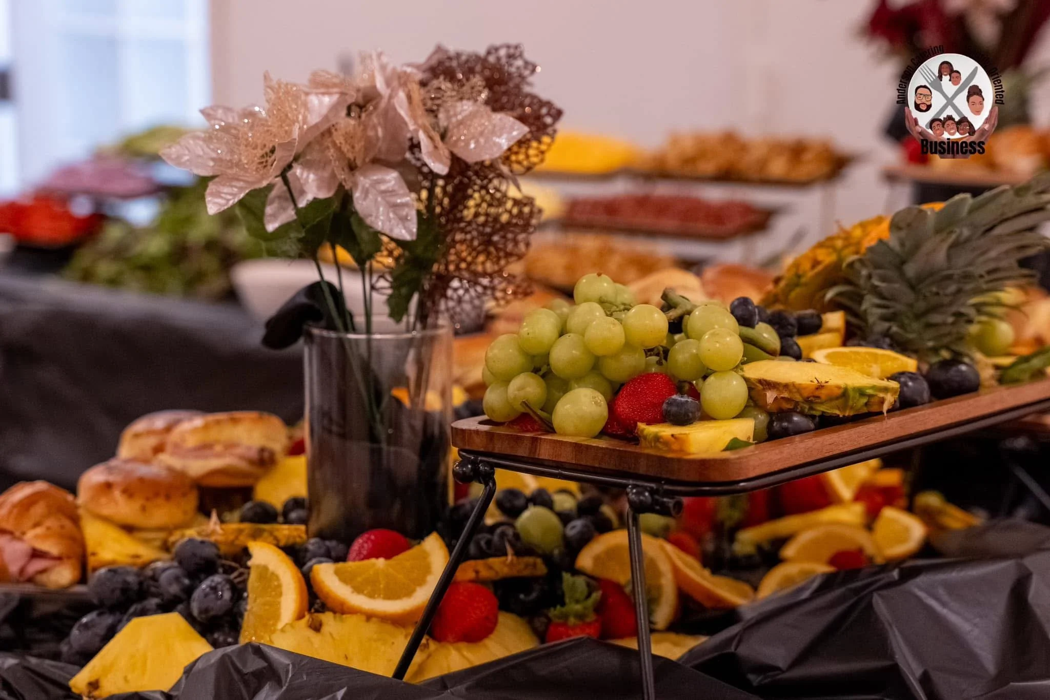 Buffet table with assorted fruits, bread, and pastries arranged on glass and wooden stands. Fruits include sliced oranges, pineapples, grapes, and strawberries. Pastries and bread are placed around for serving.