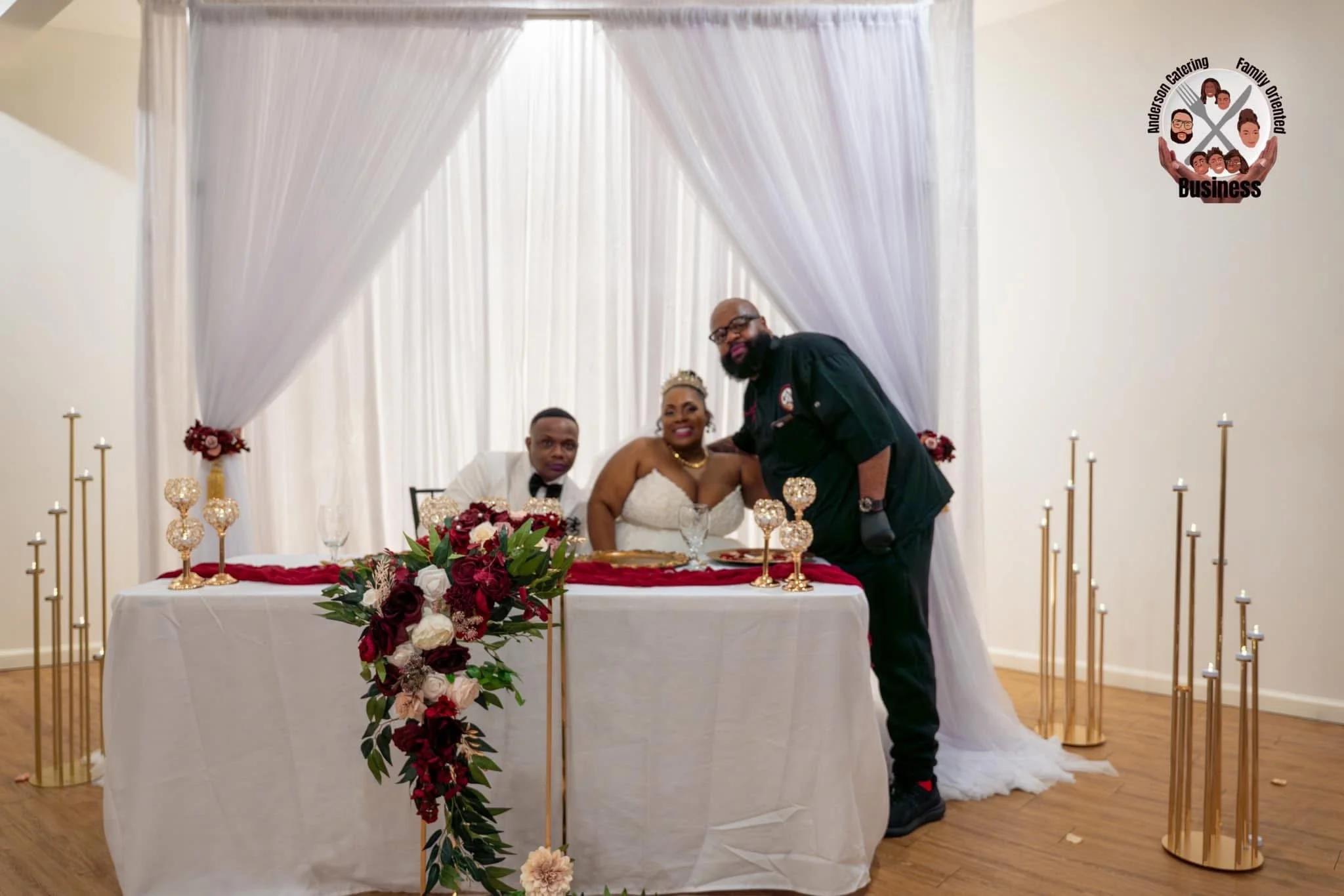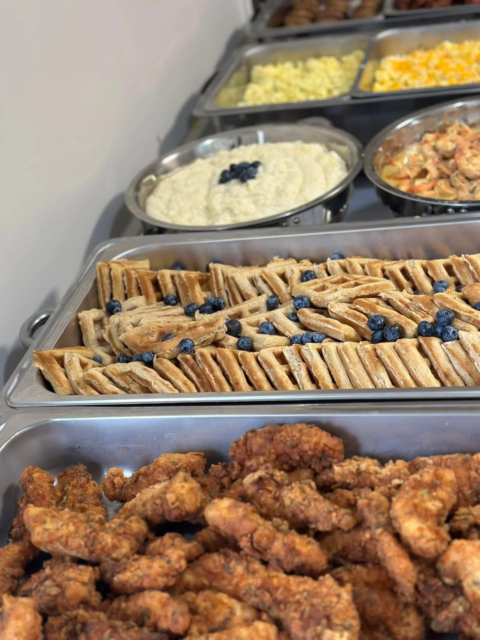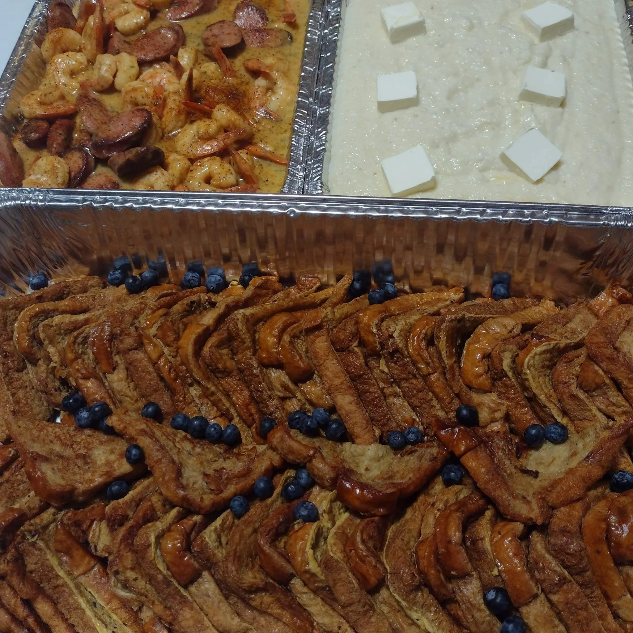 Buffet table with assorted fruits, bread, and pastries arranged on glass and wooden stands. Fruits include sliced oranges, pineapples, grapes, and strawberries. Pastries and bread are placed around for serving.