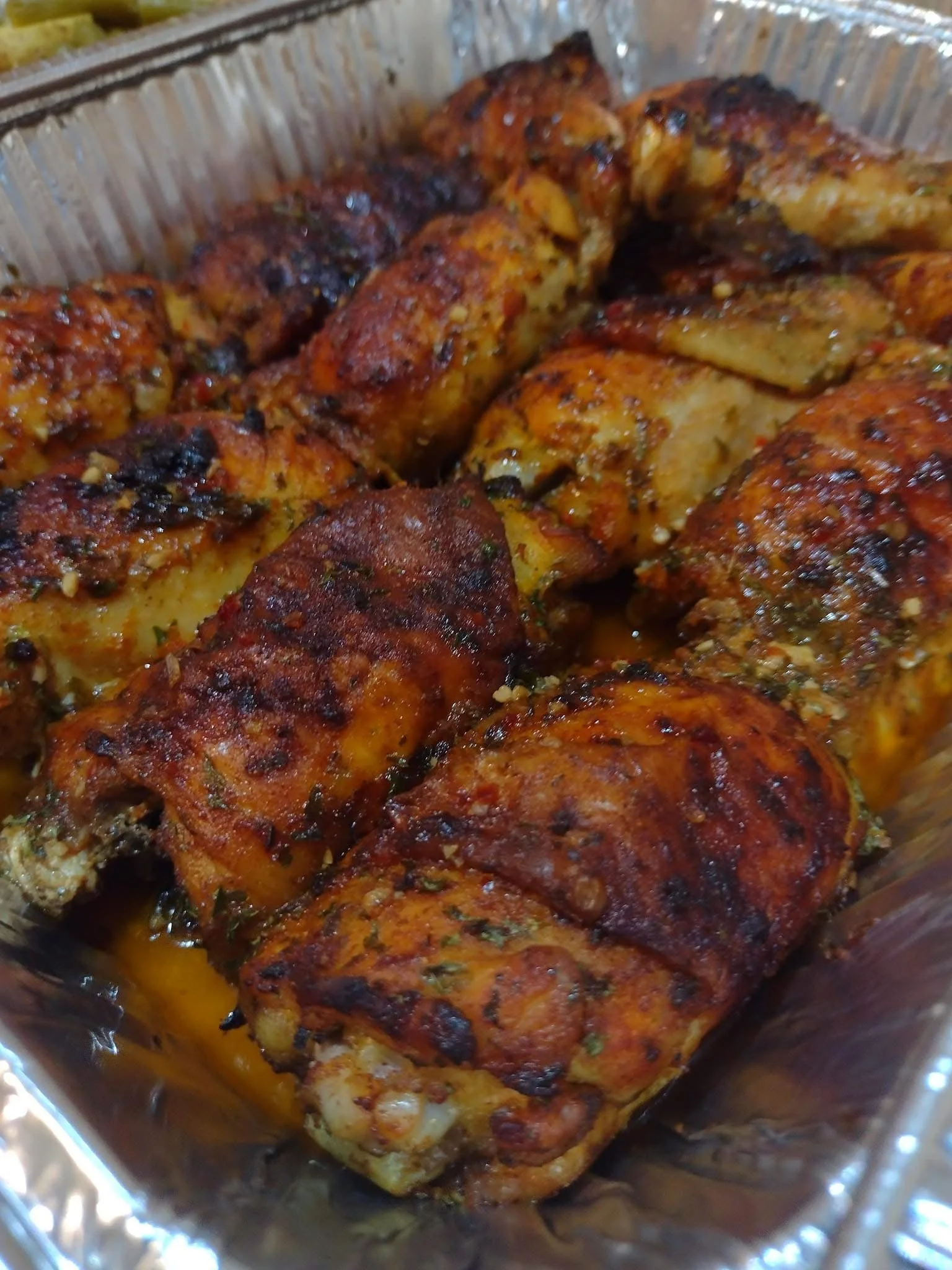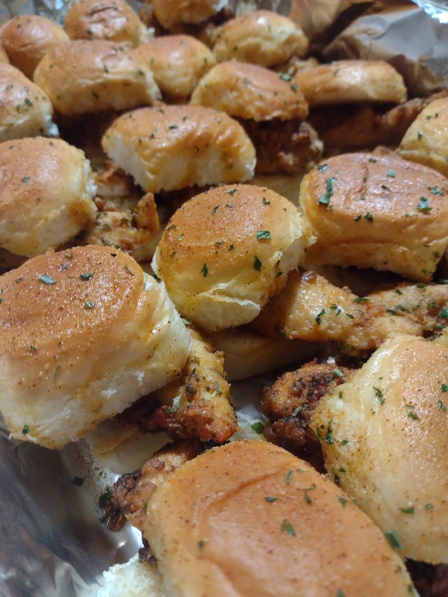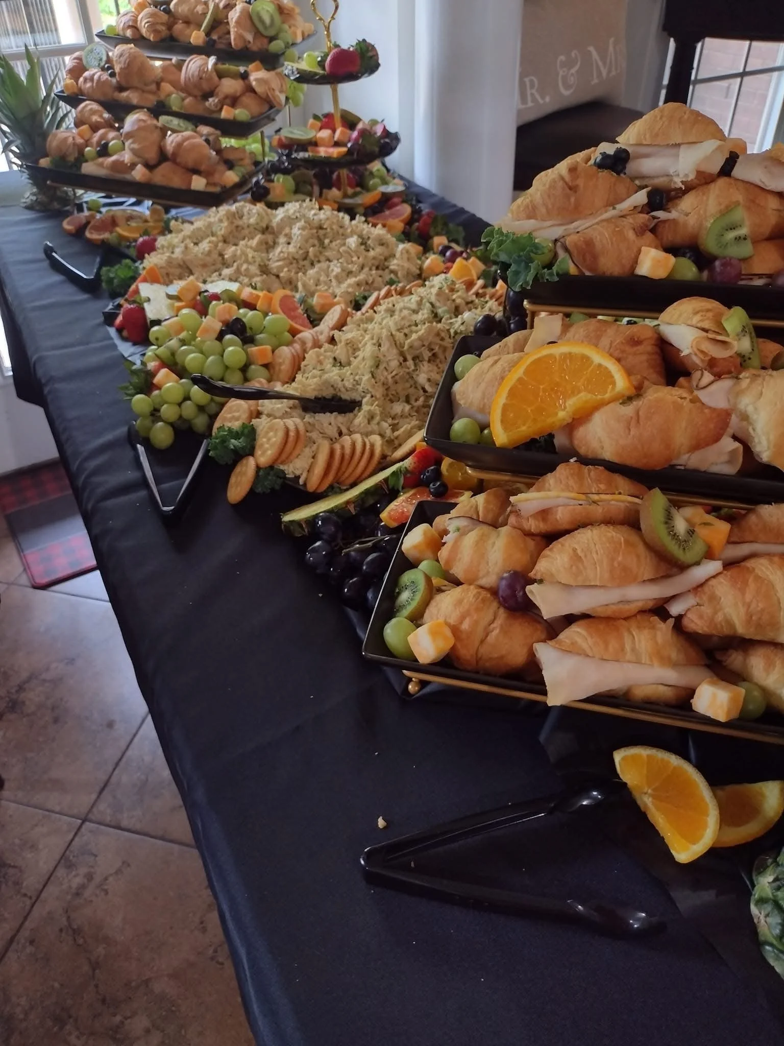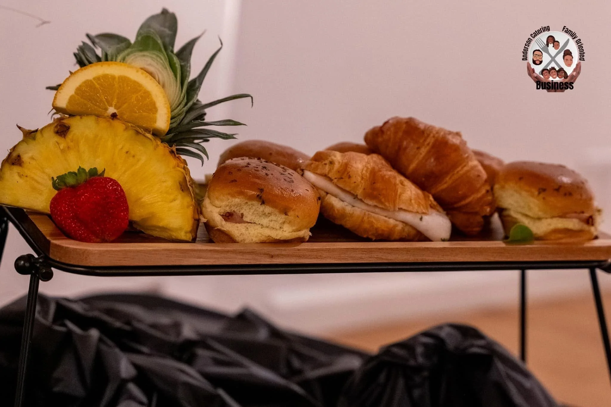 Assorted sandwiches on croissants and buns with fresh fruit like grapes, oranges, and pineapples on a black tablecloth.